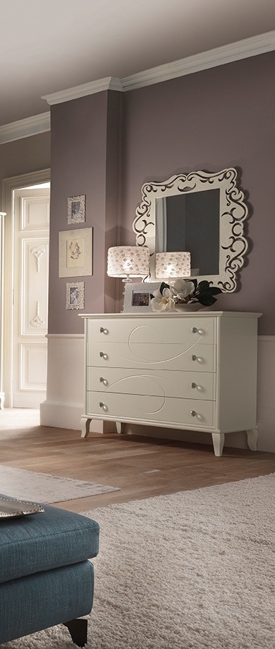 Masivní stylová komoda s reliéfy a stylovými úchyty. Komoda se 4 šuplíky v barvě smetanové. Komodu doporučujeme sladit s produkty ze stejné řady.