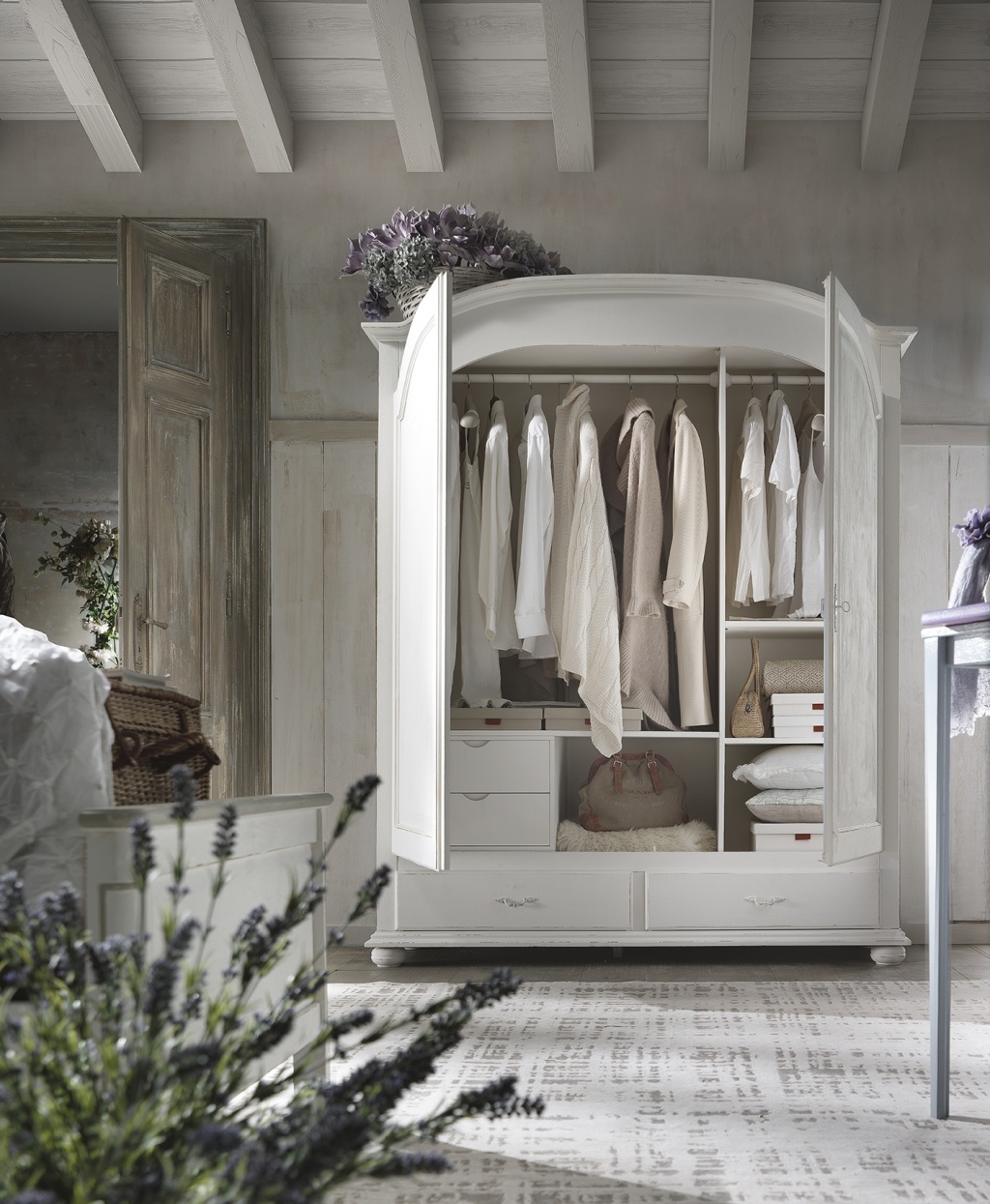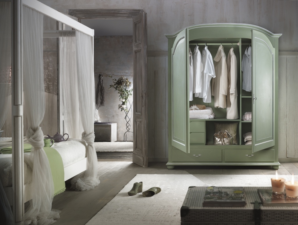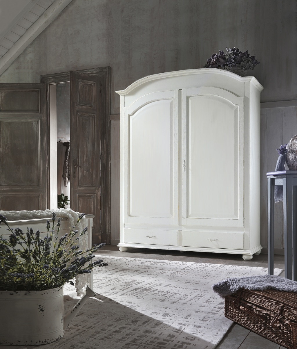 Velmi stylová, masivní šatní skříň v provedení olivové zelené patiny nebo antické bílé. Šatní skříň se 2 vnějšími šuplíky s ozdobnými úchyty a 2 vnitřními šuplíky. Šatní skříň se 4 přihrádkami a závěsnou tyčí najde své uplatnění všude tam, kde je kladen důraz na styl. Šatní skříň je demontovatelná.